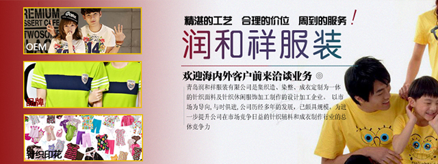 青岛润和祥服装有限公司是集织造、染整、成衣定制为一体的针织面料及针织休闲服饰加工制作的设计加工企业。 以市场为导向,与时俱进,公司历经多年的发展,已颇具规模。为进一步提升公司在市场竞争日益的针织辅料和成衣制作行业的总体竞争力,公司管理层在完善企业内部管理的同时,放眼海外积极引购国外先进的生产加工设备改善提升了我们的整体生产加工力。 主要生产高弹莱卡面料、涤盖棉、金光绒、提花布、棉毛汗布、空气层、罗纹布等各种针织布料, 主要生产文化衫、商务T恤衫、学生校服、运动休闲服、保暖内衣等各种针织服装。 精湛的工艺,合理的价位,周到的服务是公司的服务宗旨。
